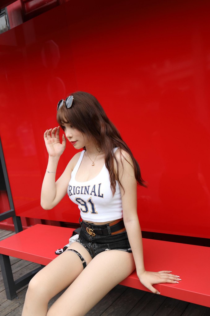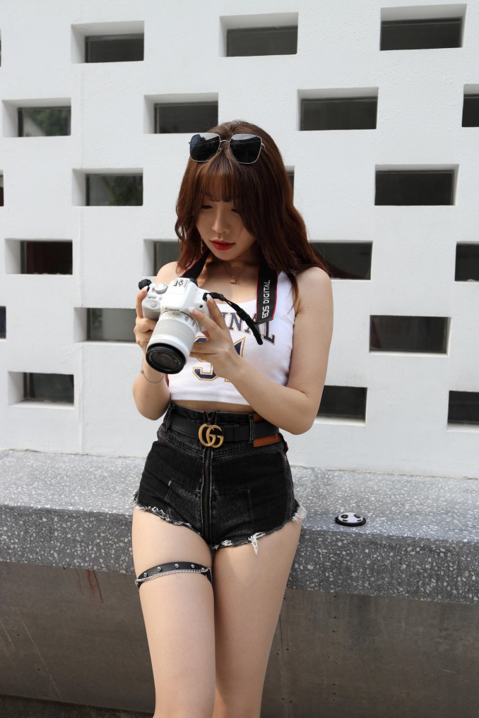 在户外玩单反相机的牛仔热裤女孩